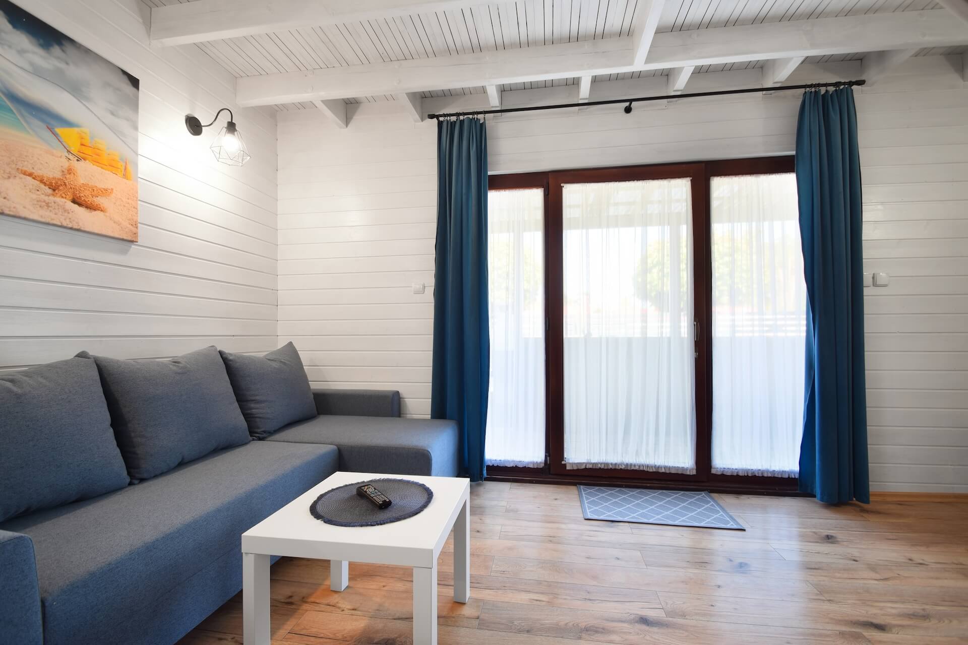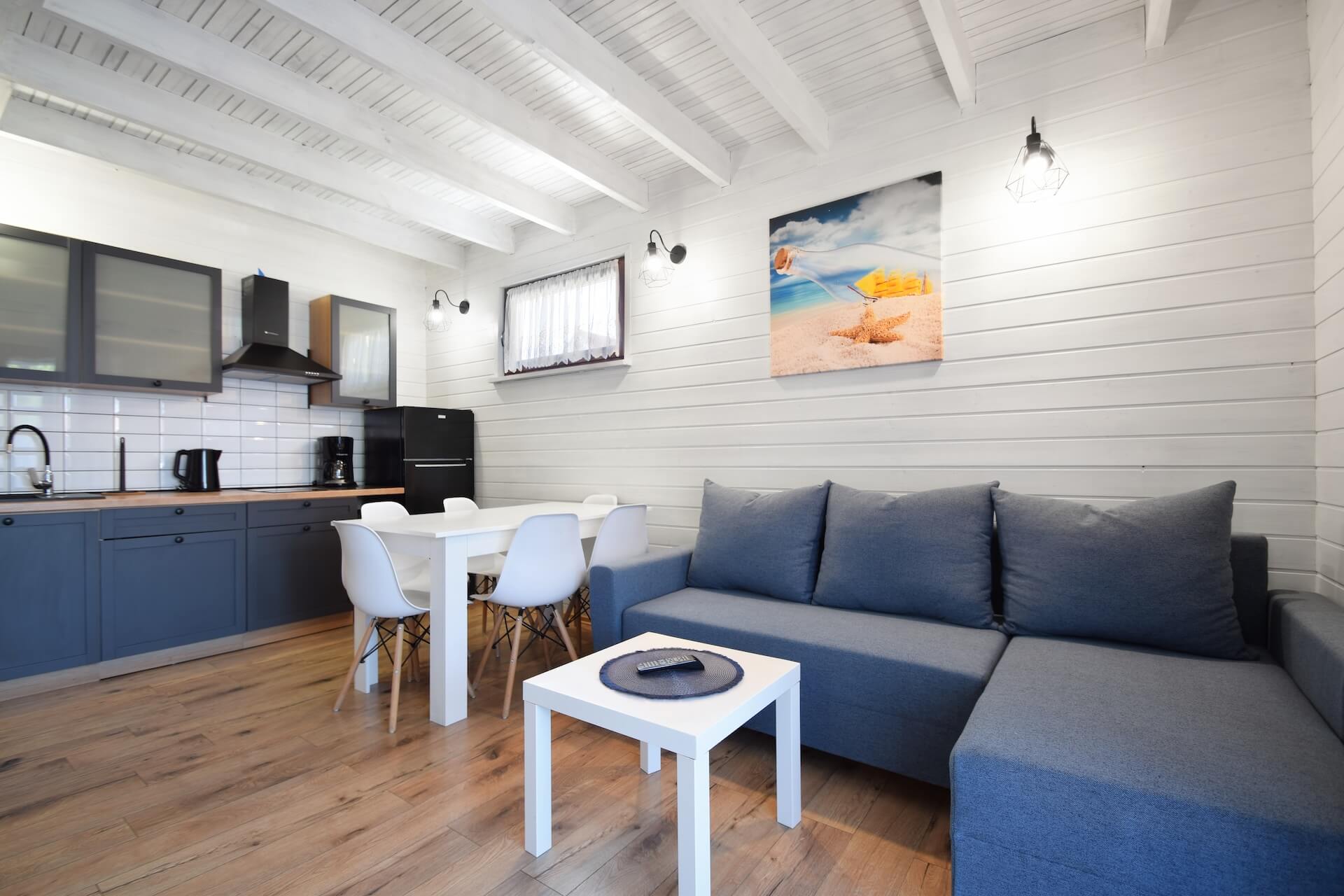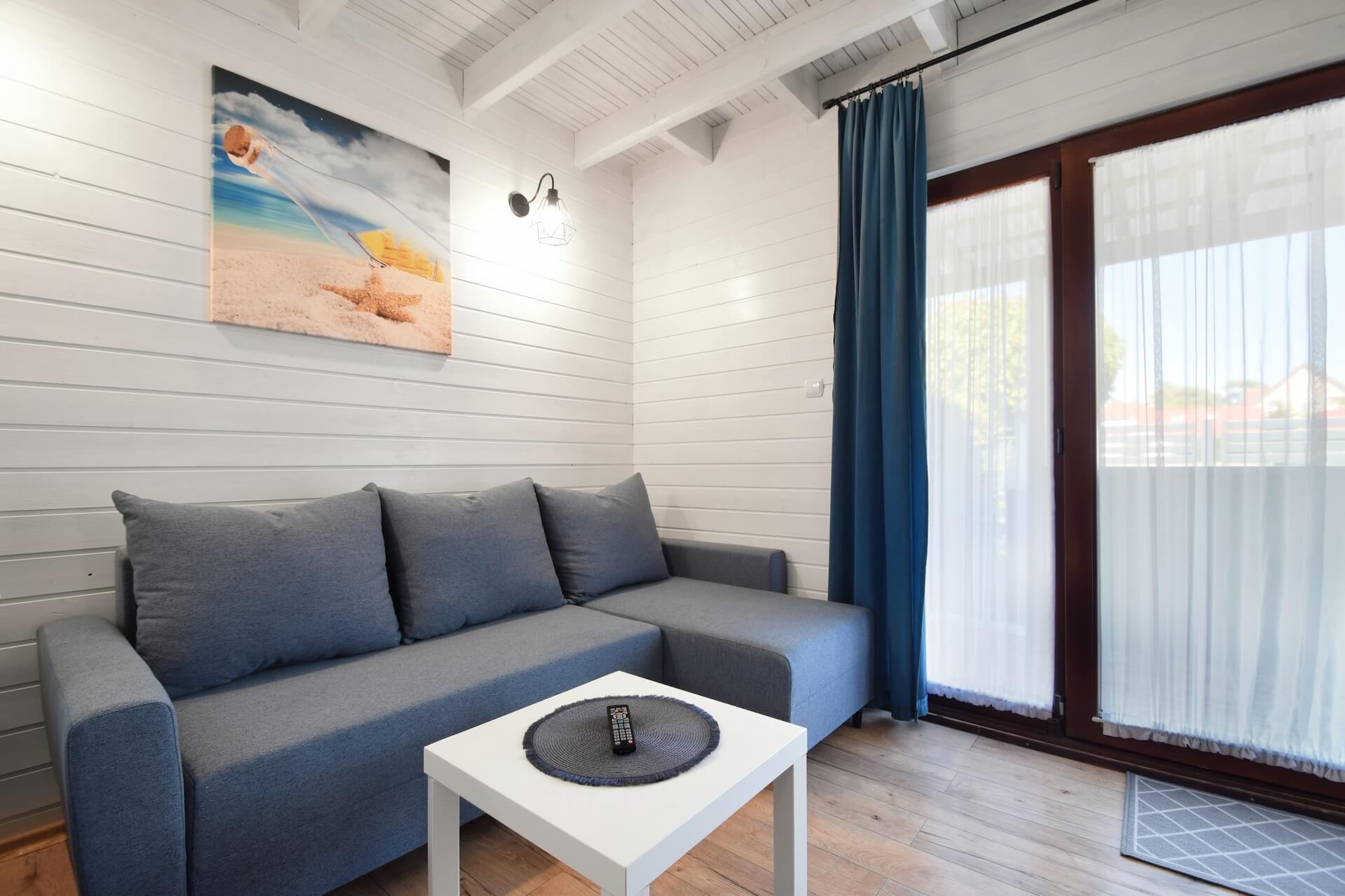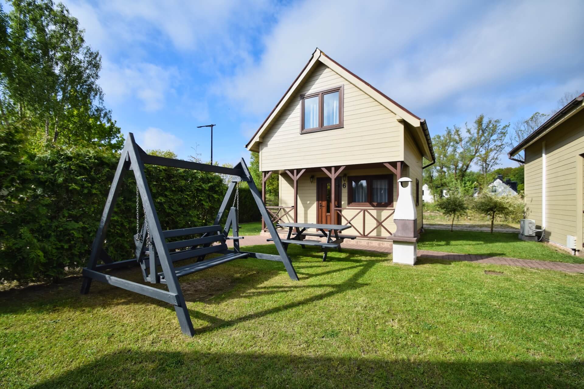 Nasze dwupoziomowe klimatyzowane domki oferują przestronność i komfort. Na parterze znajduje się duży salon z w pełni wyposażonym aneksem kuchennym oraz kanapą narożnikową, która może służyć jako dodatkowe miejsce do spania. Dodatkowo na parterze znajduje się przestronna łazienka. Na piętrze domku umieszczone są dwie trzyosobowe sypialnie oraz duża szafa. Każdy z naszych domków jest wyposażony w sprzęt plażowy, a na zewnątrz do dyspozycji gości są meble ogrodowe oraz grill.