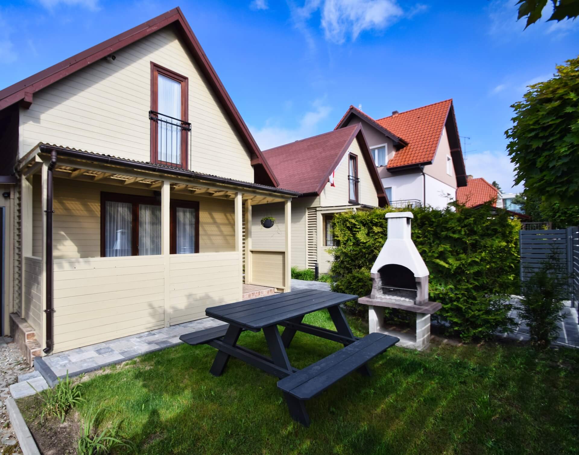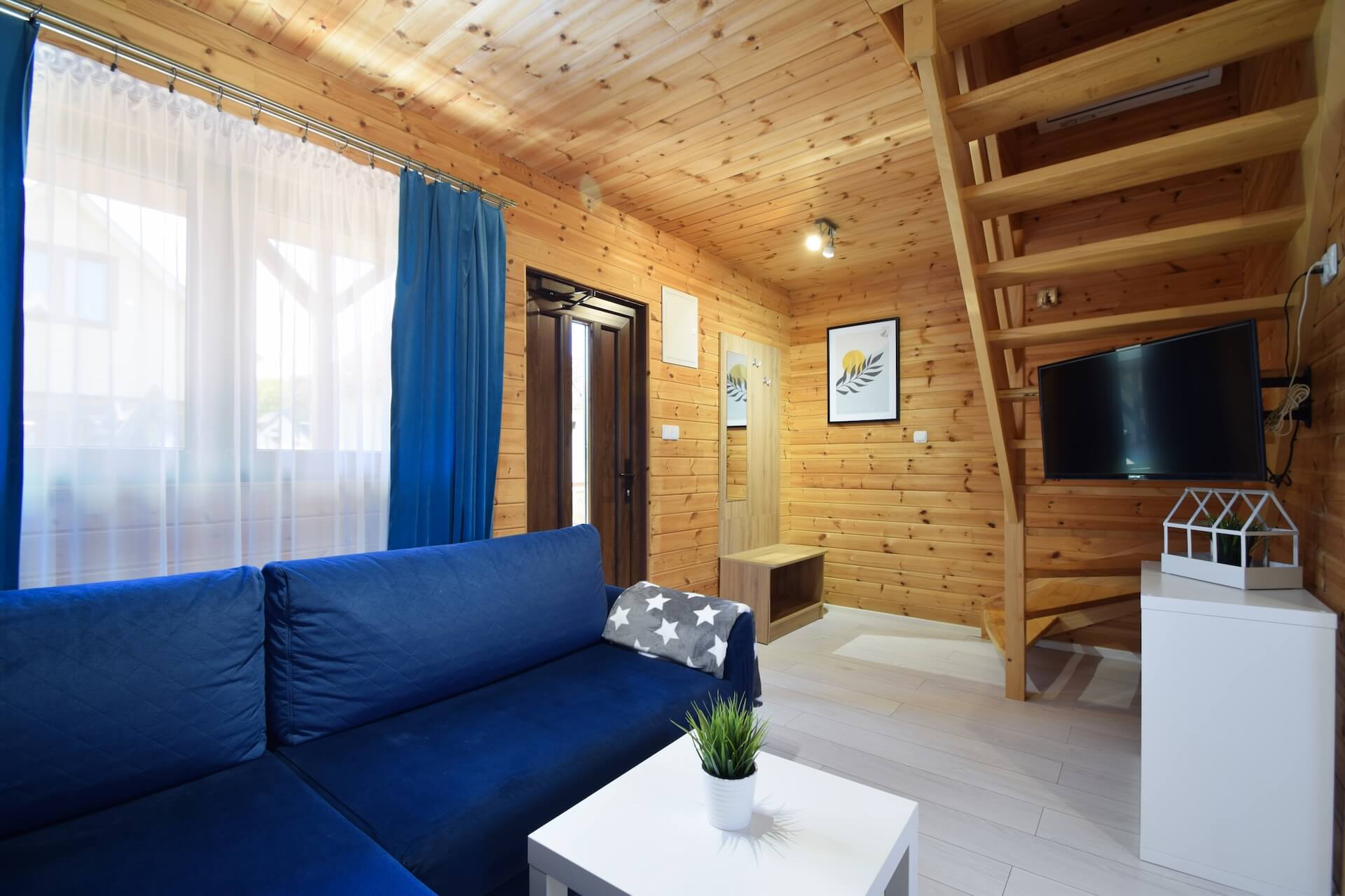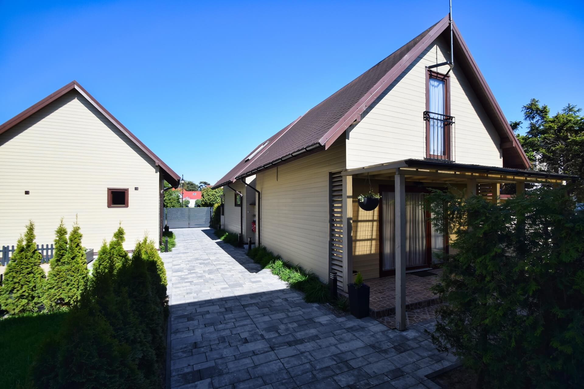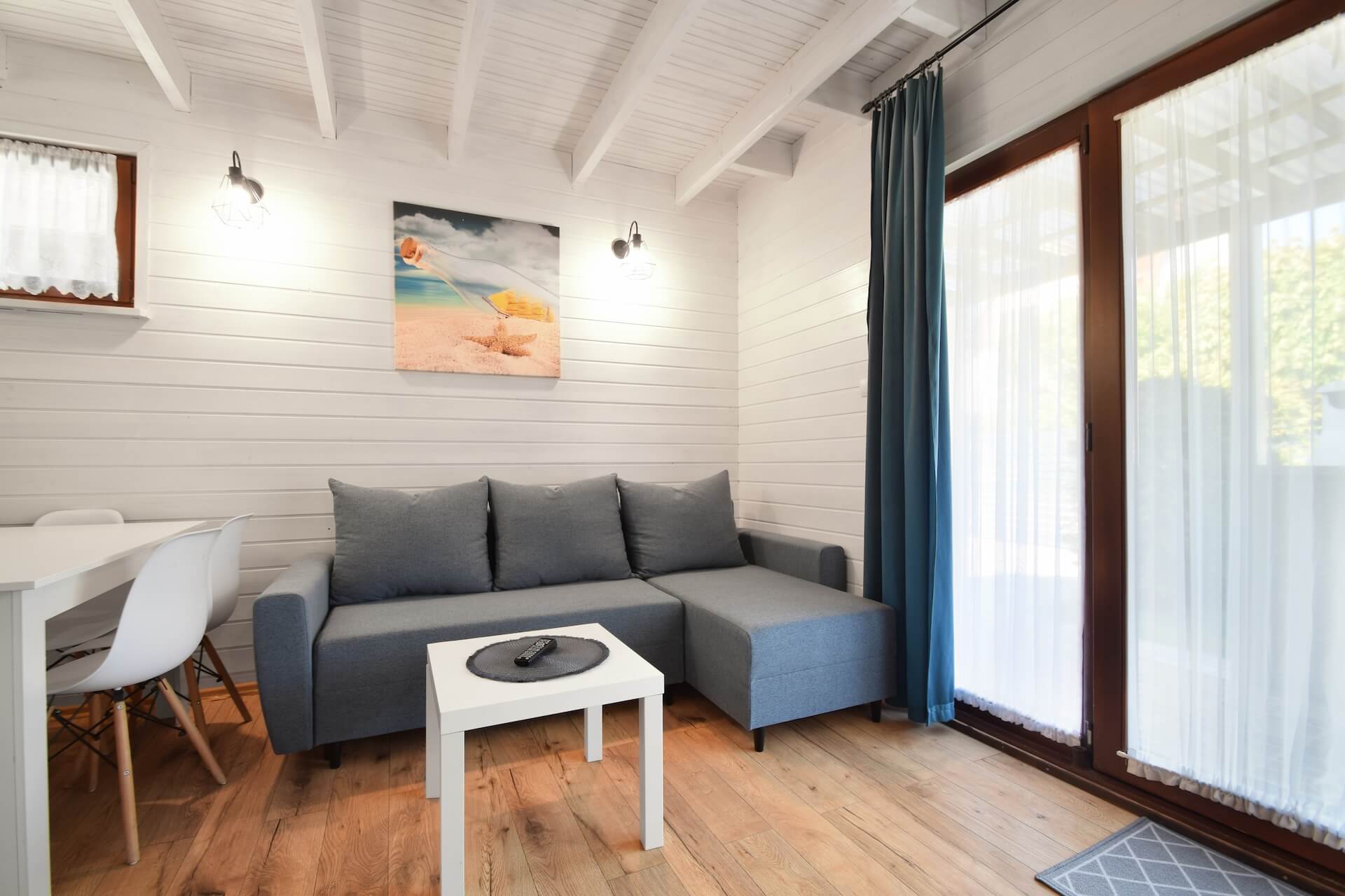 Nasze dwupoziomowe klimatyzowane domki oferują przestronność i komfort. Na parterze znajduje się duży salon z w pełni wyposażonym aneksem kuchennym oraz kanapą narożnikową, która może służyć jako dodatkowe miejsce do spania. Dodatkowo na parterze znajduje się przestronna łazienka. Na piętrze domku umieszczone są dwie trzyosobowe sypialnie oraz duża szafa. Każdy z naszych domków jest wyposażony w sprzęt plażowy, a na zewnątrz do dyspozycji gości są meble ogrodowe oraz grill.