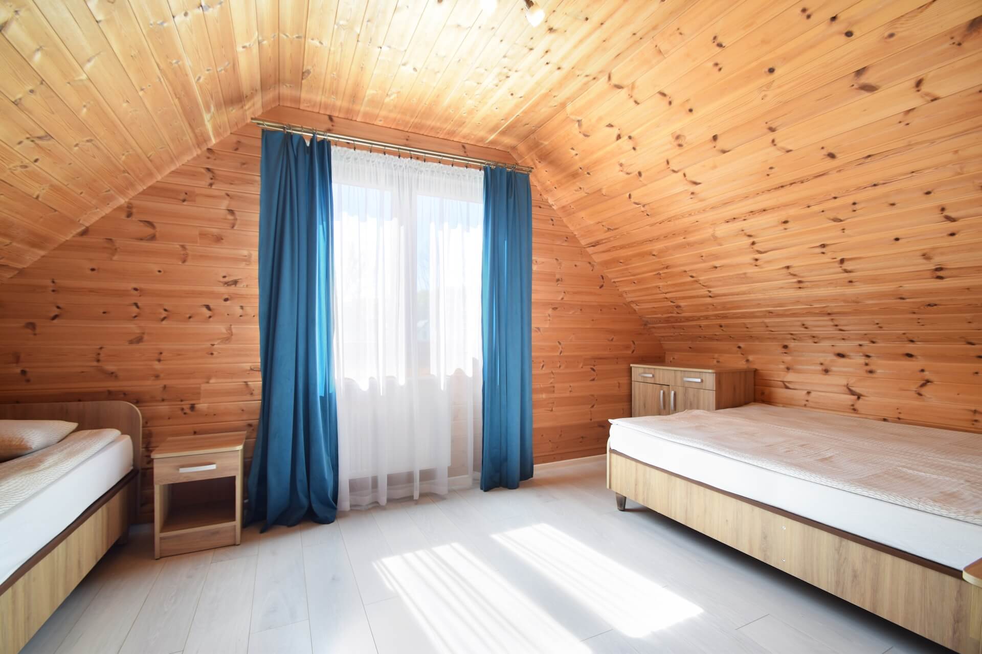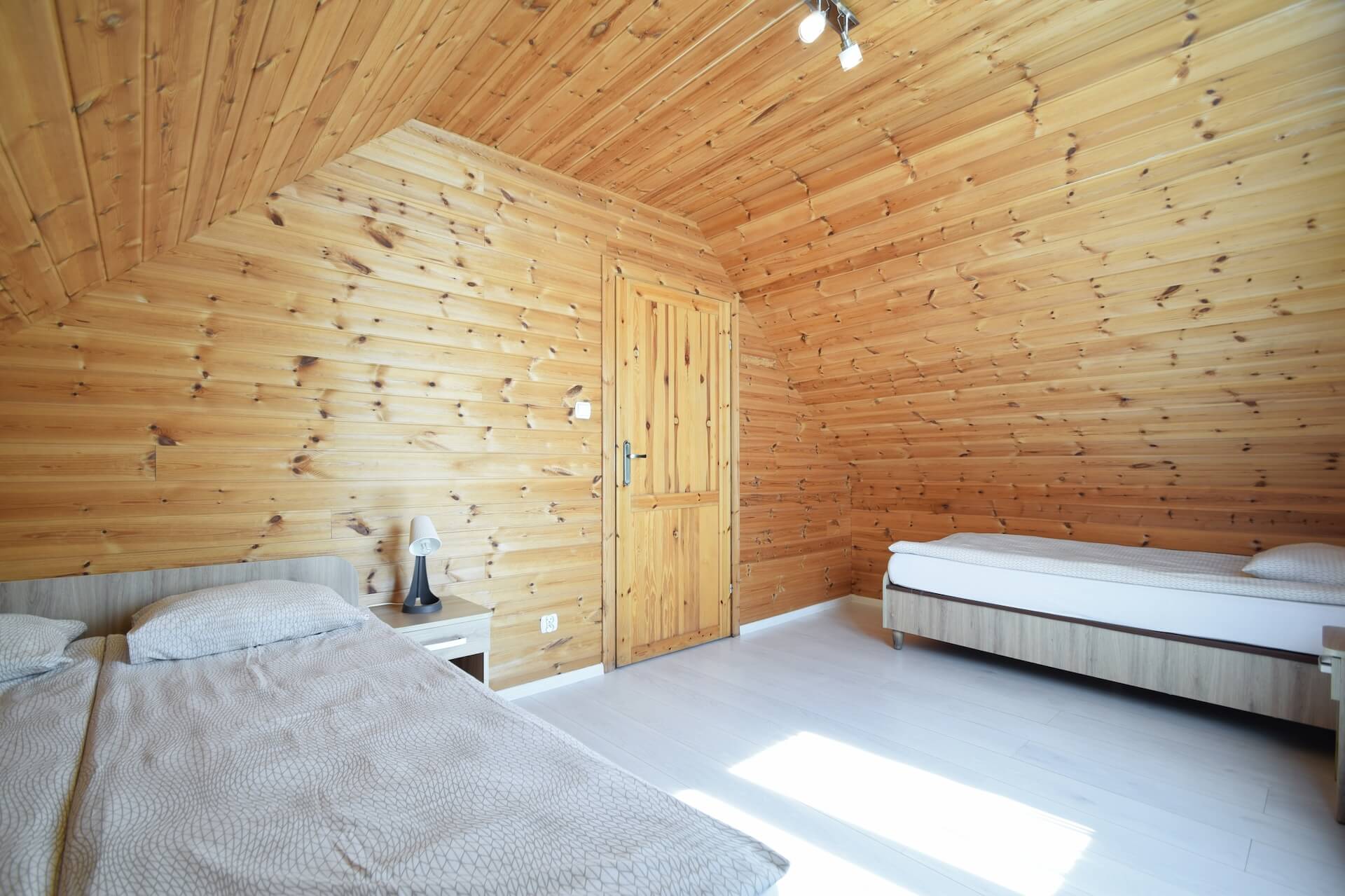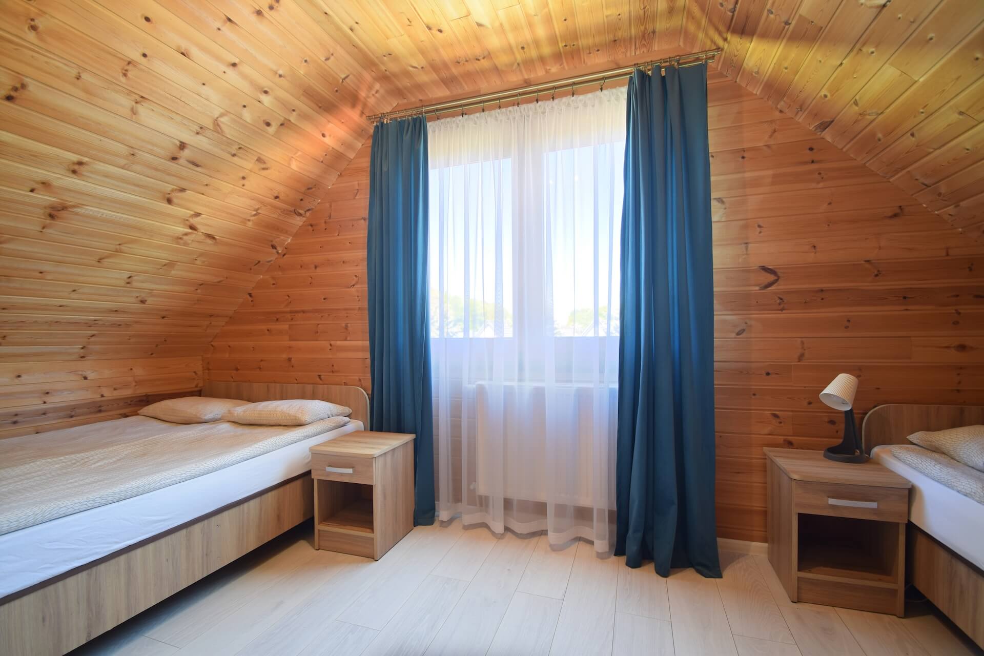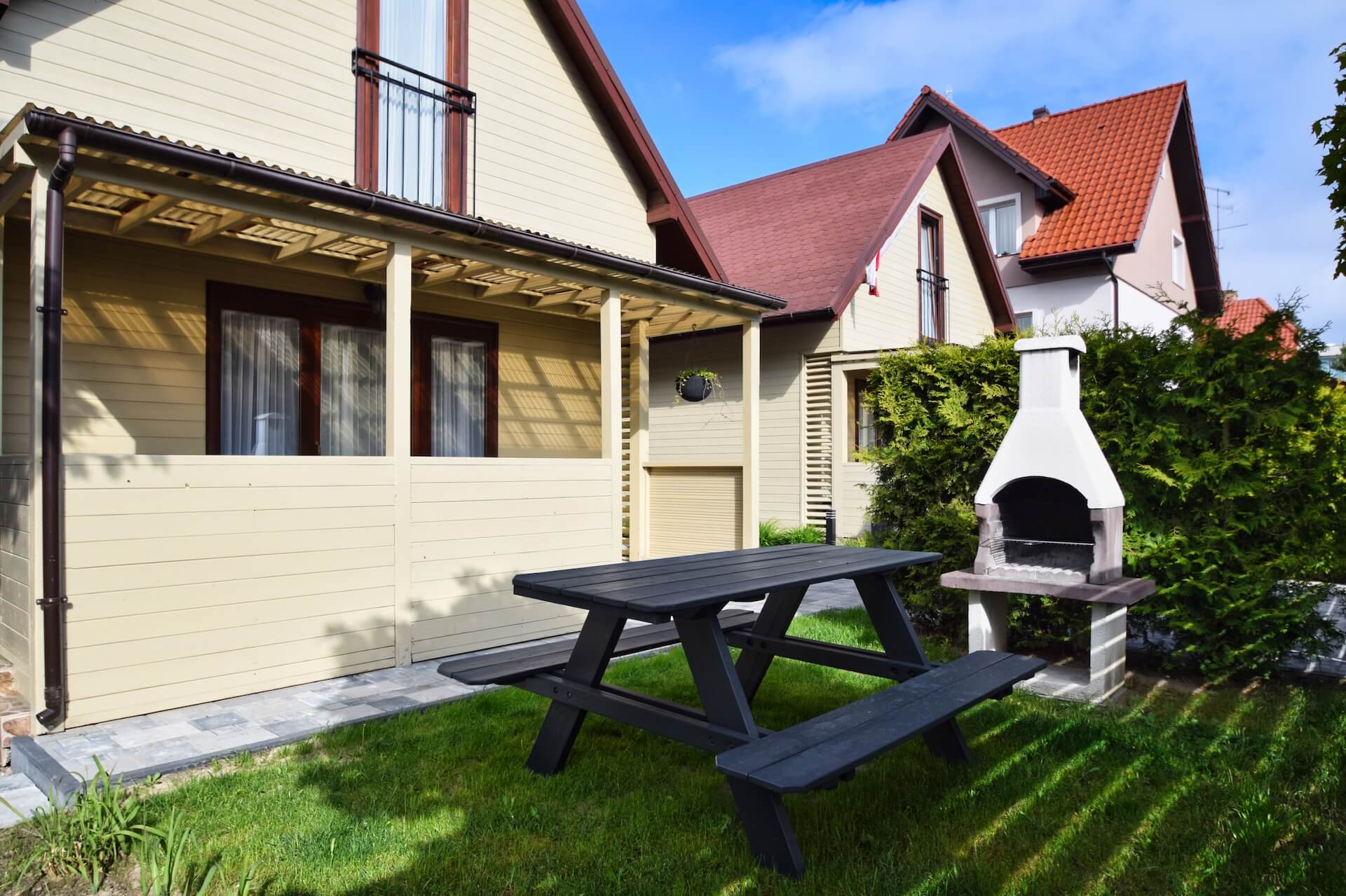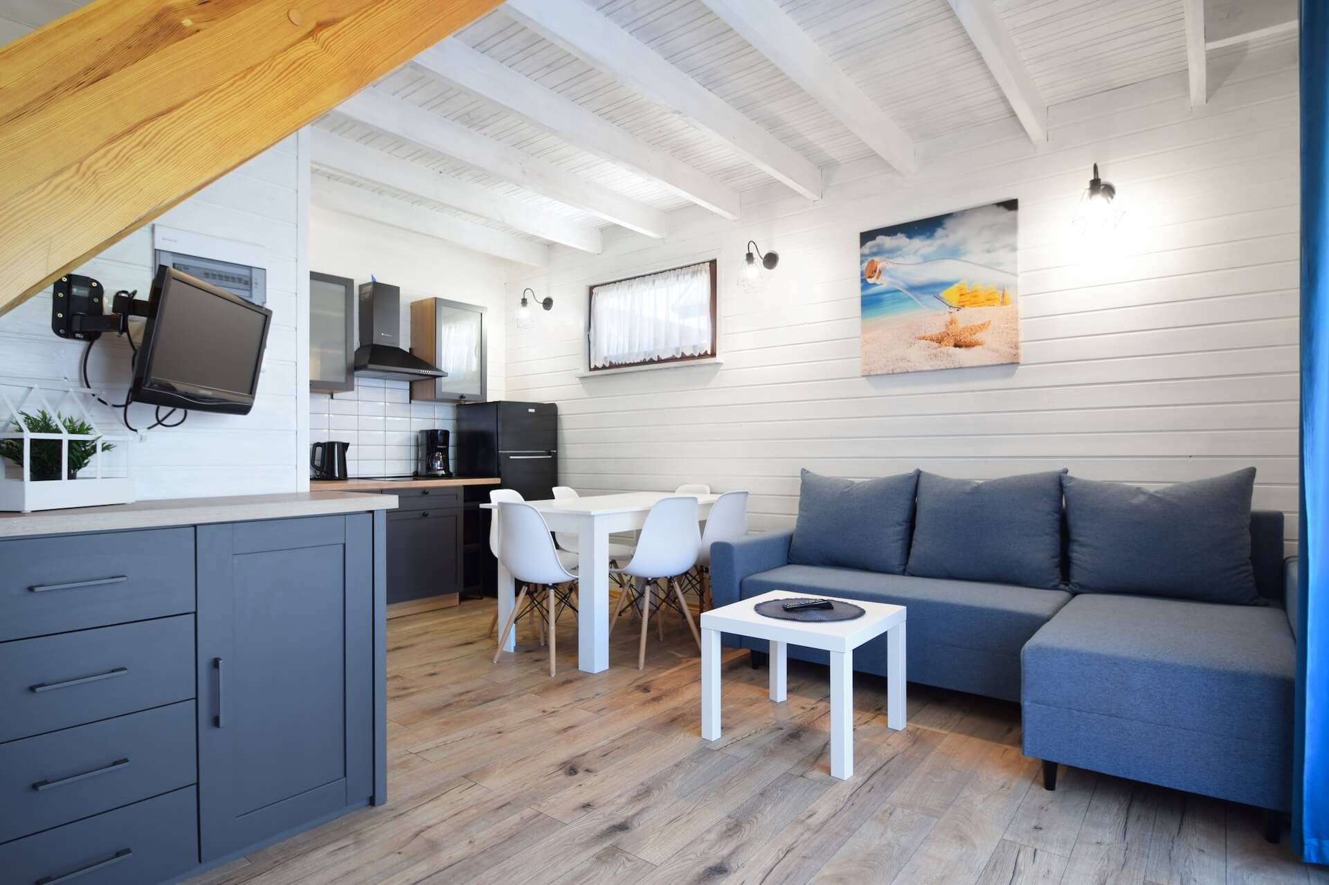 Nasze dwupoziomowe klimatyzowane domki oferują przestronność i komfort. Na parterze znajduje się duży salon z w pełni wyposażonym aneksem kuchennym oraz kanapą narożnikową, która może służyć jako dodatkowe miejsce do spania. Dodatkowo na parterze znajduje się przestronna łazienka. Na piętrze domku umieszczone są dwie trzyosobowe sypialnie oraz duża szafa. Każdy z naszych domków jest wyposażony w sprzęt plażowy, a na zewnątrz do dyspozycji gości są meble ogrodowe oraz grill.