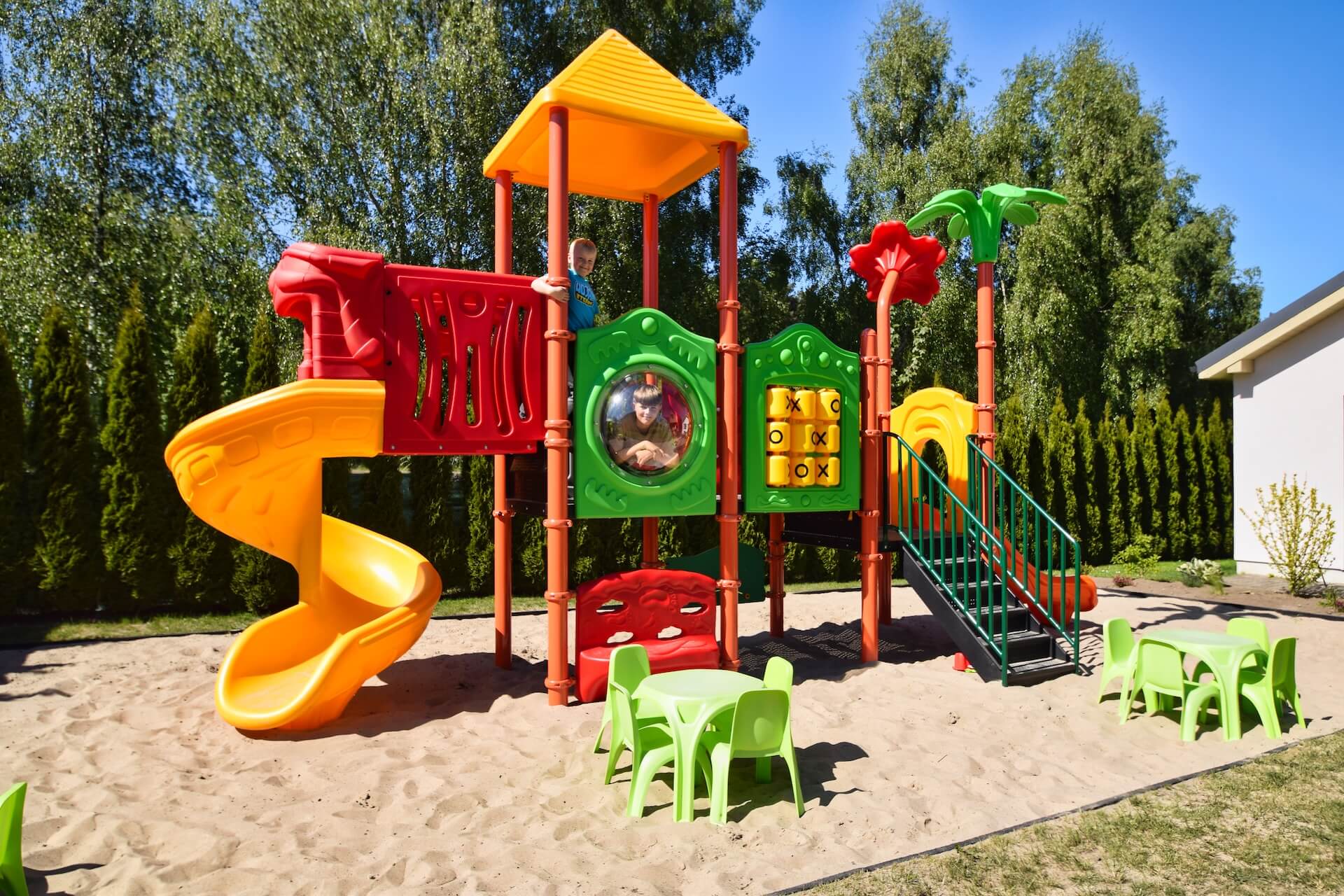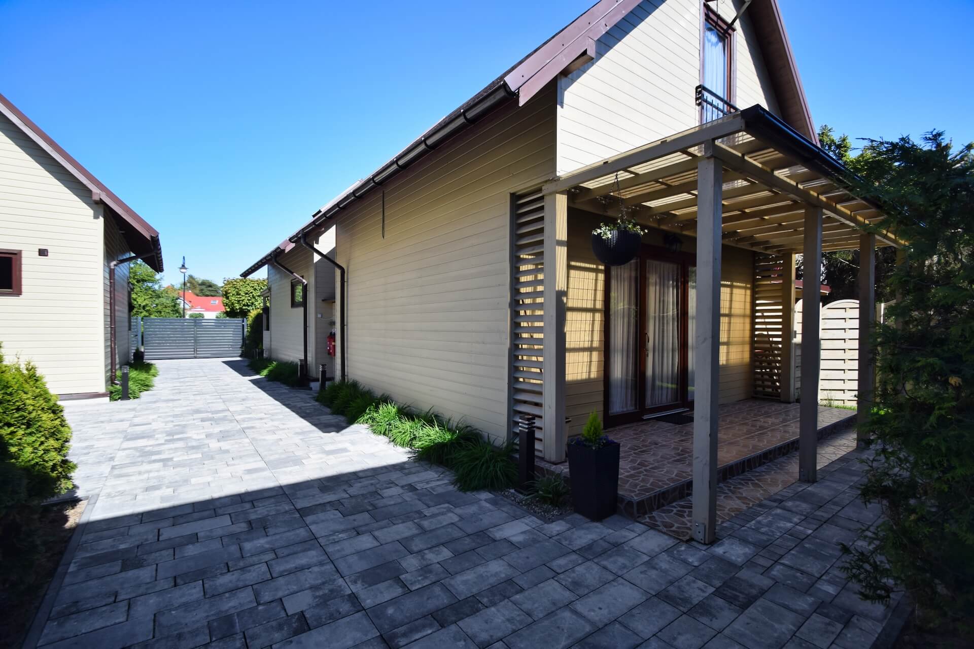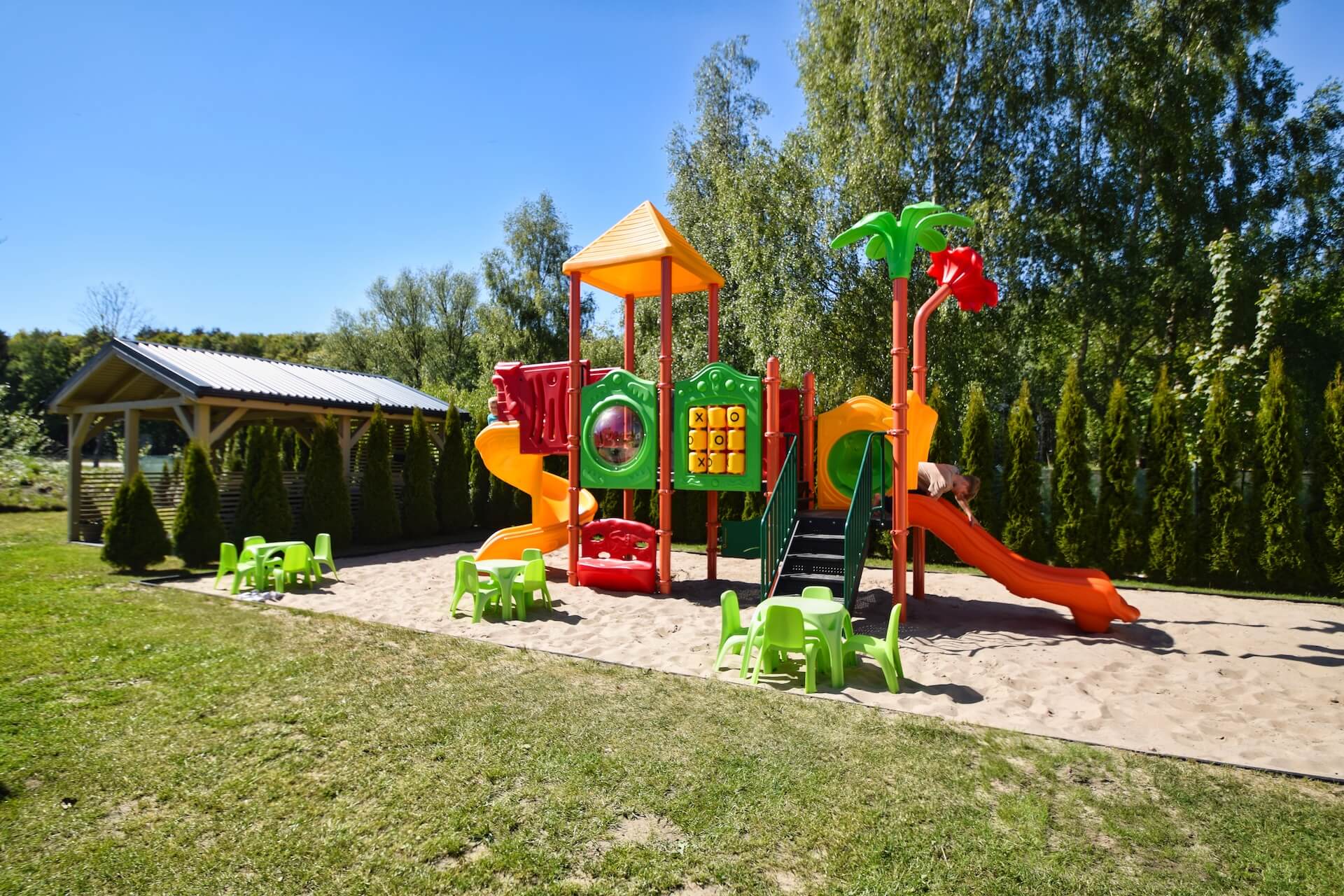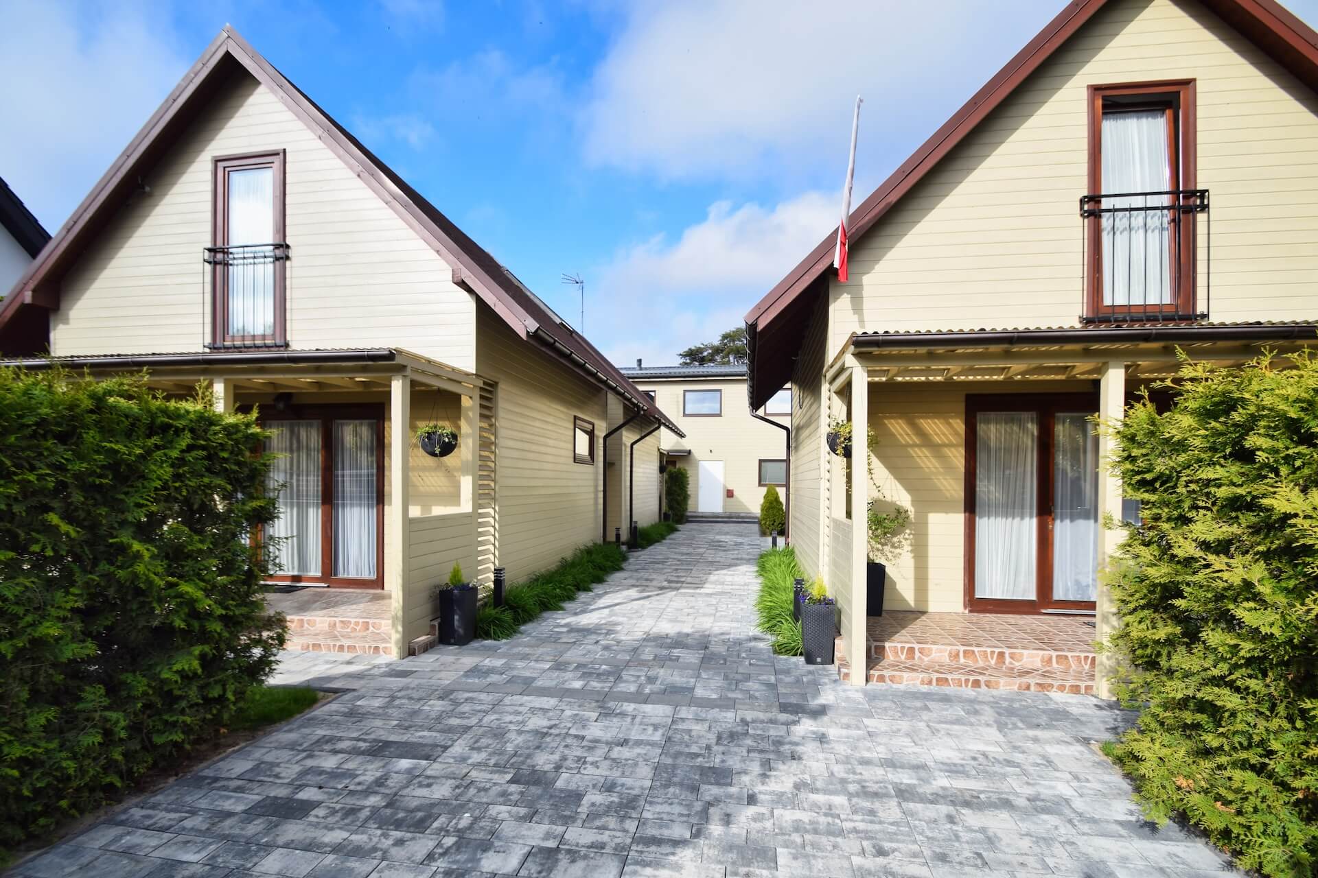 Nasze dwupoziomowe klimatyzowane domki oferują przestronność i komfort. Na parterze znajduje się duży salon z w pełni wyposażonym aneksem kuchennym oraz kanapą narożnikową, która może służyć jako dodatkowe miejsce do spania. Dodatkowo na parterze znajduje się przestronna łazienka. Na piętrze domku umieszczone są dwie trzyosobowe sypialnie oraz duża szafa. Każdy z naszych domków jest wyposażony w sprzęt plażowy, a na zewnątrz do dyspozycji gości są meble ogrodowe oraz grill.